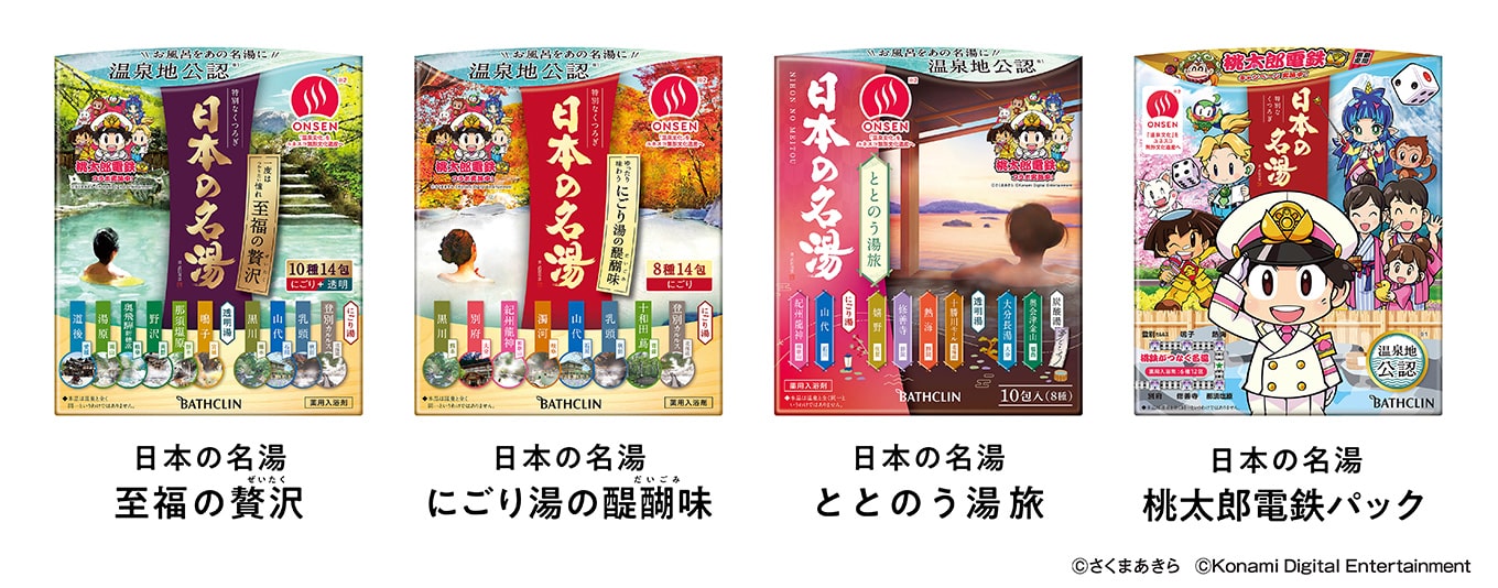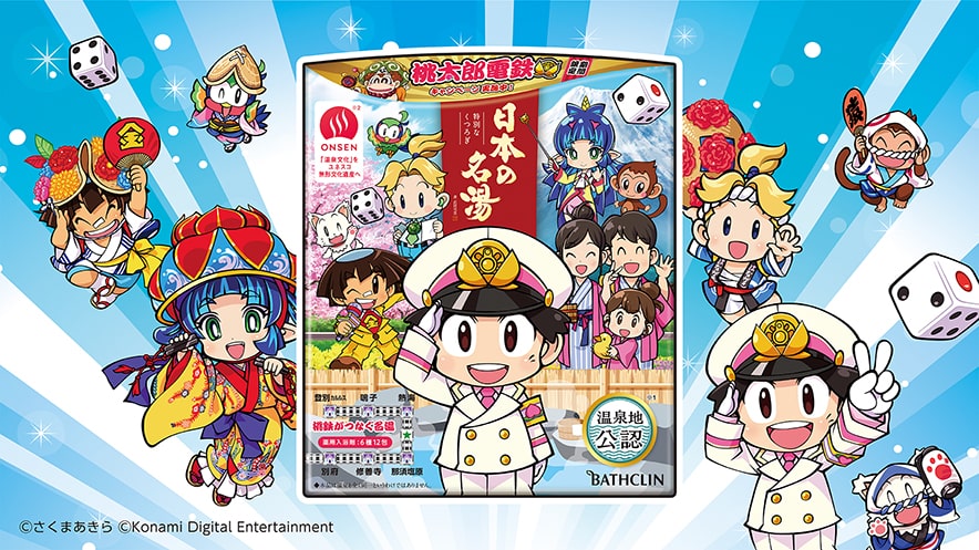1986年に誕生した「日本の名湯」シリーズは、開発者が実際に温泉地を訪れ、温泉分析書をもとに湯質を徹底研究、色と香りで情緒を表現し、各温泉地に認められた「温泉地公認*」入浴剤です。一方、1988年に第一作を発売以来、世代を超えて親しまれている「桃太郎電鉄」シリーズも実際に現地で取材を行い、各地の魅力をゲームに反映することで、プレーヤーに“旅する楽しさ”を届けてきました。このように、地域の魅力を活かし、細部までこだわってものづくりを行ってきたという共通の姿勢から、今回のコラボレーションが実現しました。
