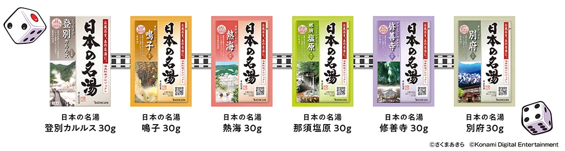 本品は、開発者が実際に温泉地を訪れて湯ざわりを体感し、さらに温泉分析書を基に成分データを収集。入浴剤に適した成分で上位3成分を選び、実際の温泉にできるだけ近い比率で処方することにもこだわった温泉タイプ入浴剤です。また、香りや色も追求し、その温泉地に訪れたような情緒感も大切にしています。本品では、ゲーム『桃太郎電鉄2 ~あなたの町も きっとある~』に登場する全国の駅の名湯6か所をアソート(登別カルルス、鳴子、熱海、那須塩原、修善寺、別府)にしています。さらに、今回のコラボレーションに合わせて、本シリーズ既存アイテムの「桃太郎電鉄」デザインの数量限定企画品を10月より順次発売予定です。