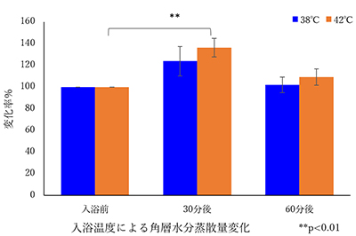 ぬるめのお湯(38℃)での入浴は、熱めのお湯(42℃)での入浴と比較して、入浴後の角層水分量の減少を抑制し、角層水分蒸散量*も抑制しました。このことは、ぬるめのお湯での入浴は、スキンケアを考慮した入浴の条件と考えられました。
