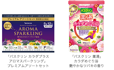 近年のアロマブームを受け、入浴剤に「香りが良いこと」を求める若い女性が増加。さらに多種類入った「アソートタイプ」のニーズが高まっていることから、「バスクリン カラダプラス アロマスパークリング アロマバスコレクション」を発売。「ファイングレープフルーツの香り」が加わり、6種類の天然アロマの贅沢な香りを日替わりで楽しめる商品です。