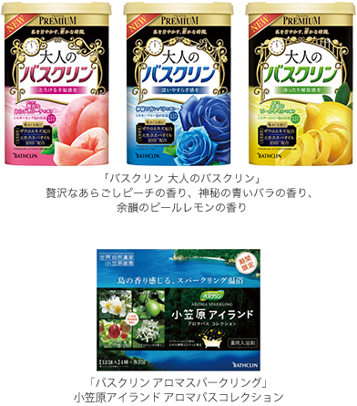 「バスクリン」85周年に発売して好評だった「大人のバスクリン」に、3つの香りを追加。今回は“お子様が成長し、一人で入浴することが増えた40代~50代の母親”に向けた香りと湯色で優雅なバスタイムを演出。また、香りに関心が高く、アソートタイプが好まれることから、「バスクリン アロマスパークリング」より、「小笠原アイランド アロマバスコレクション」を発売。4種類の香りを日替わりで楽しめ、小笠原諸島に行った気分を味わえます。