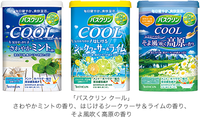“毎日健やか、爽快温浴”のクールタイプ入浴剤「バスクリン クール」を“夏の気分転換に気分で選べる入浴剤”にリニューアル。「夏になりたい気分」の調査に基づき、「すっきりリフレッシュ」「かろやかにして、元気な気分」「おだやかにリラックス」の3タイプの香りから選べるようにしました。